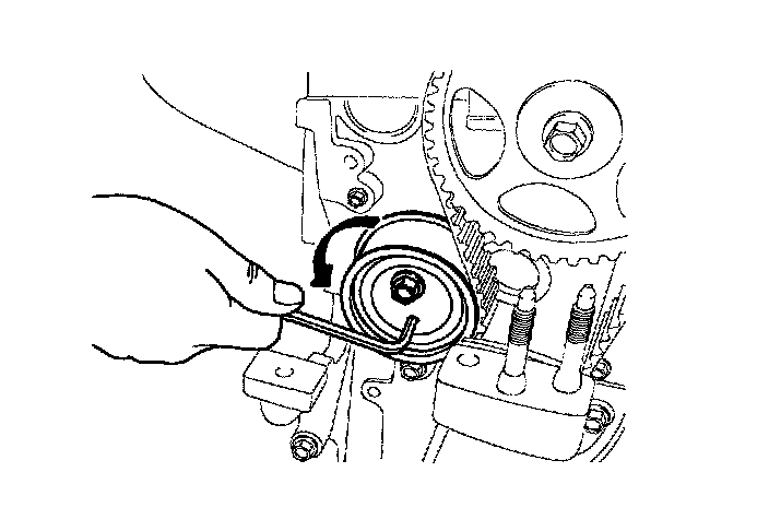 NOTE: If the timing belt is going to be reused, make an arrow indicating the turning direction to make sure that the belt is reinstalled in the same direction as before.