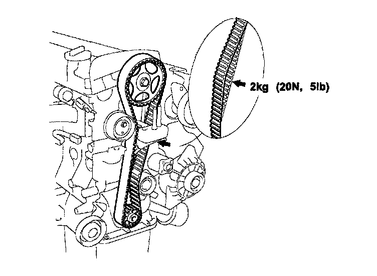 4) Recheck the belt tension. When the tension side of timing belt is pushed horizontally with a moderate force [approximately 2kg (20 N, 5 lbs.)], the timing belt cog end sags in approximately 4 - 6mm (0.16 - 0.24 inch).