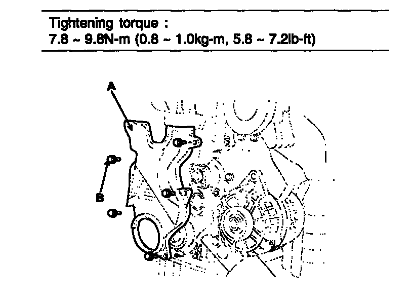 11. Install the timing belt lower cover(A) with 5bolts(B).