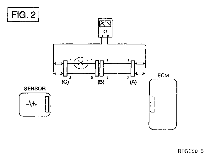 b. Disconnect connector (B), and measure for resistance between connector (C) and (B1) and between (B2) and (A) as shown in [FIG.3].