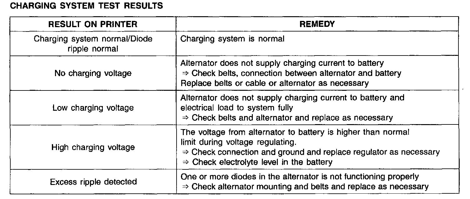 6. Take a relevant action according to the test results by referring to the table below after shutting off the engine and disconnect the tester clamps from the battery.