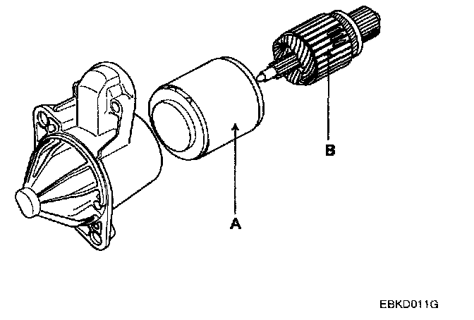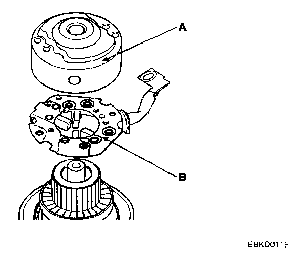 4. Remove the rear bracket (A) and brush holder assembly (B).