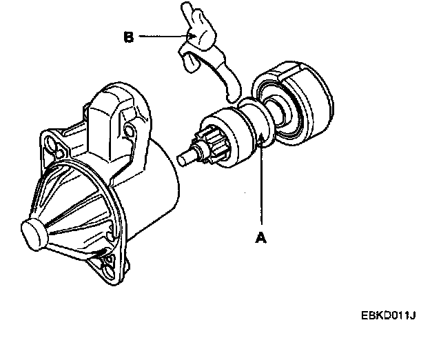NOTE: Using a suitable pulling tool (A), pull the overrunning clutch stop ring (B) over the stopper (C).
