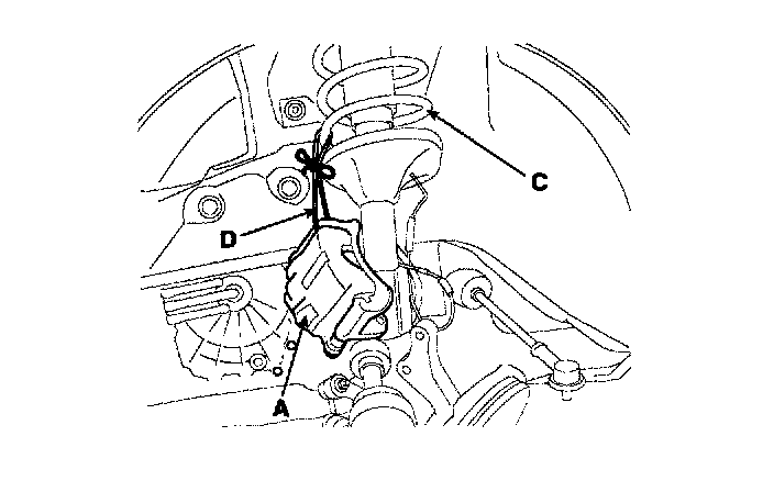 3. Remove the caliper(A) from the knuckle(B) and hang the caliper(A) on the front damper(C) with wire(D).