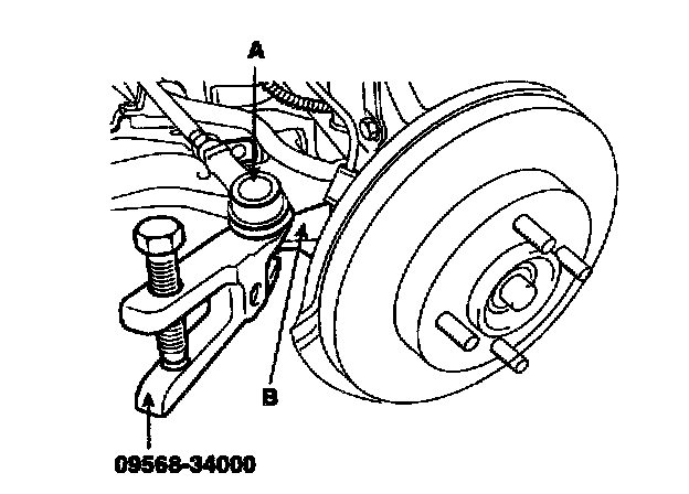 c. Disconnect the ball joint(A) from knuckle(B) using the special tool (09568-34000).