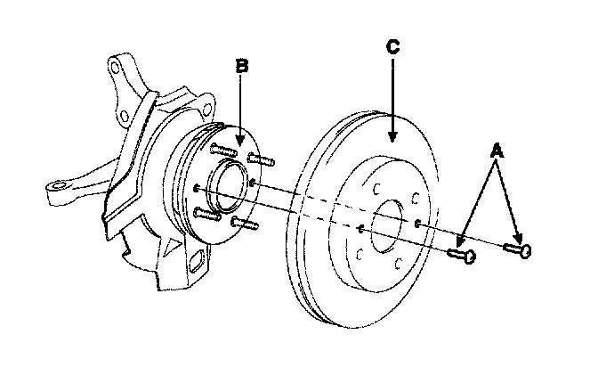 1. After removing the fixed screws(A) mounting the brake disc(C), remove the brake disc(C) from the hub(B).