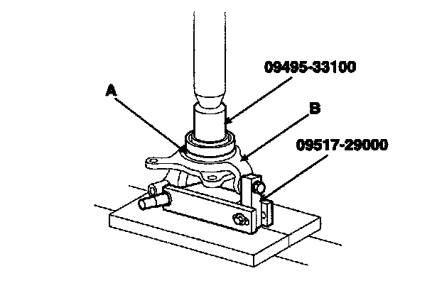 7. Using the special tools (09495-33100, 09517-29000), remove the wheel bearing outer race(A)from the knuckle(B).