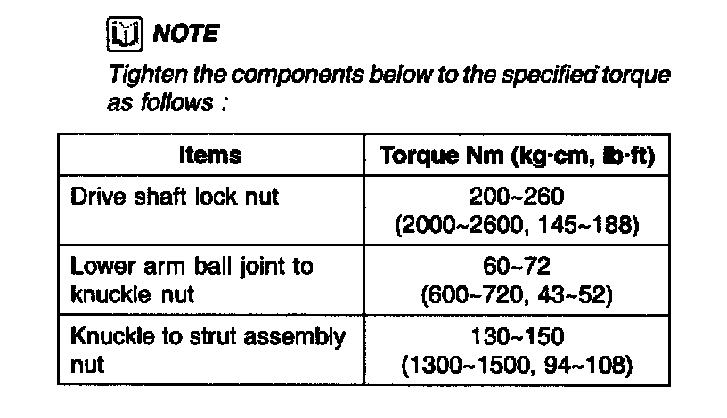 8. If the hub axial play exceeds the limit while the nut is tightened to 200 - 260 Nm (2000 - 2600 kg-cm, 145 - 188 ft. lbs.), the bearing, hub and knuckle are not installed correctly. Repeat the disassembly and assembly procedure.