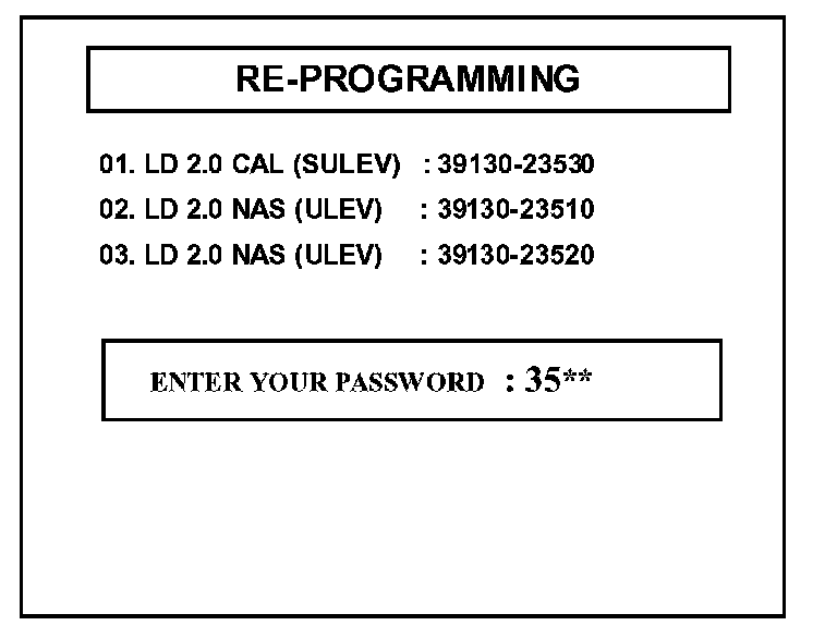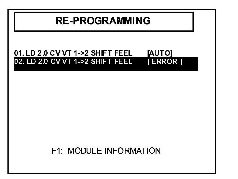 ^ "REPROGRAMMING ERROR PLEASE CHECK SYSTEM" - In this case, you must reprogram manually by selecting menu option "02. LD 2.0 CVVT 1->2 SHIFT FEEL [ERROR]".
