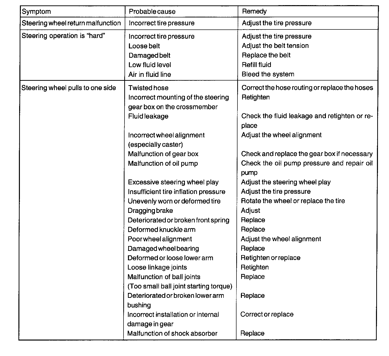 3) A slight vibration may be felt when a stationary steering effort is made due to the condition of the road surface. To check whether the vibration actually exists or not, test-drive the vehicle on a dry concrete or asphalt surface. A very slight amount of vibration is not a malfunction.