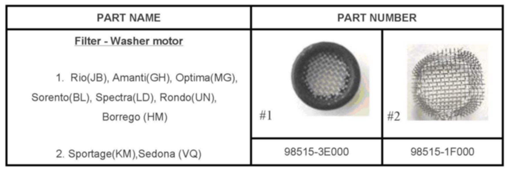 This Pitstop bulletin provides information relating to foreign debris accumulation on the windshield washer pump inlet filter. Some 2003-2008 model year Kia vehicles may experience a limited application of windshield washer fluid when using the washer function. Limited application of windshield washer fluid can be caused by foreign debris on the washer pump inlet filter. To correct for this condition, a replacement washer pump inlet filter and windshield reservoir cleaning procedure is available. Do NOT replace windshield washer pump assembly for restricted inlet filters, failure to do so could lead to costly warranty charge backs.