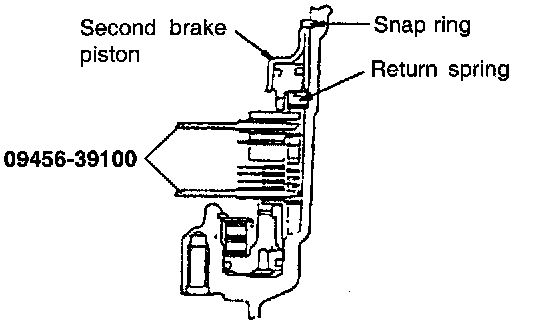 SECOND BRAKE END PLAY ADJUSTMENTReplace the pressure plate of the second brake with the special tool, and then install the brake disc and brake plate as shown in the image. Install the return spring, second brake piston and snap ring.