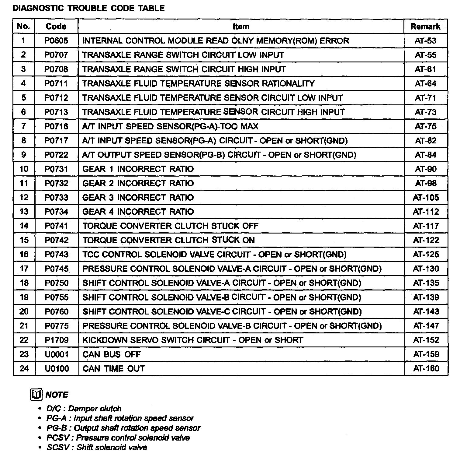Diagnostic Trouble Code Table