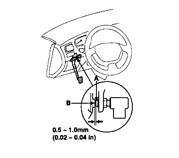 BRAKE SWITCH CLEARANCEScrew in the brake switch until its plunger is fully depressed (threaded end (A) touching the pad (B) on the pedal arm) then brake off the switch 3/4 turn to make 0.5 - 1.0 mm (0.02 - 0.04 inch) of clearance between the brake switch connector. Make sure that the brake lights go off when the pedal is released.