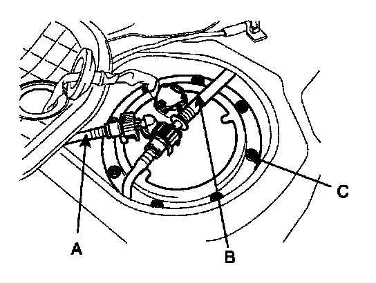 3. Unscrew the fuel pump mounting bolts (C) and remove the fuel pump assembly.