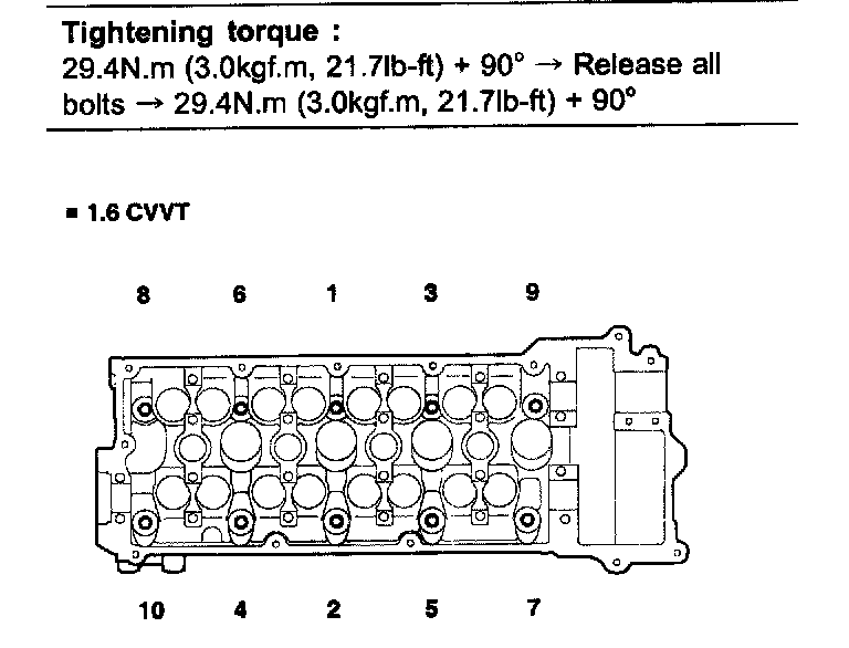 Using 8 mm and 10 mm hexagon wrench, install and tighten the 10 cylinder head bolts and plate washers, in several passes, in the sequence shown.
