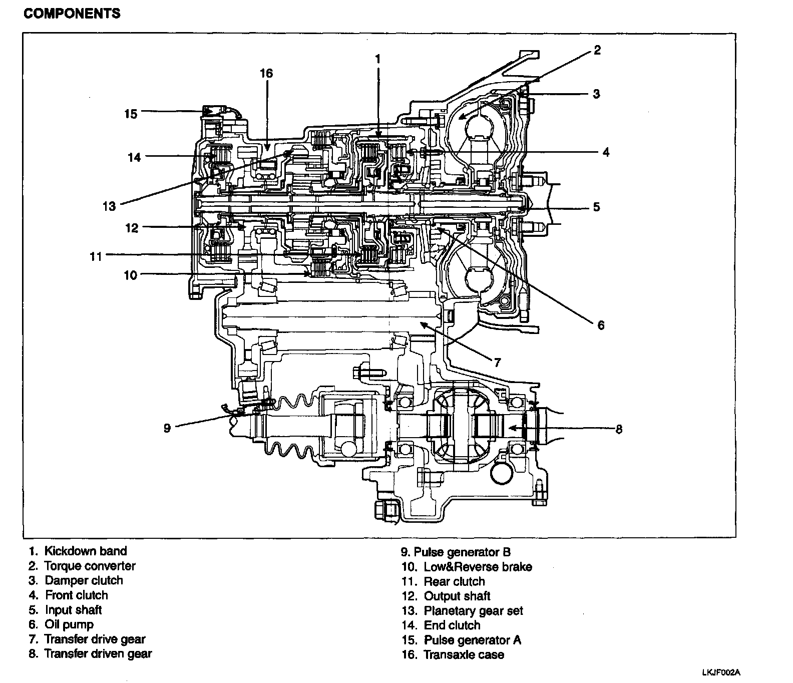 Input shaft -> Rear clutch retainer -> Front clutch -> Kick-down drum -> Reverse sun gear -> Long pinion -> Ring gear -> Transfer driven gear