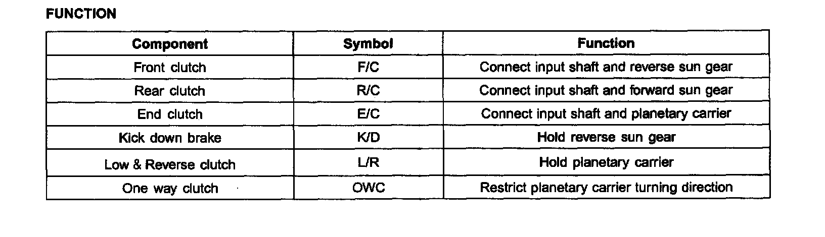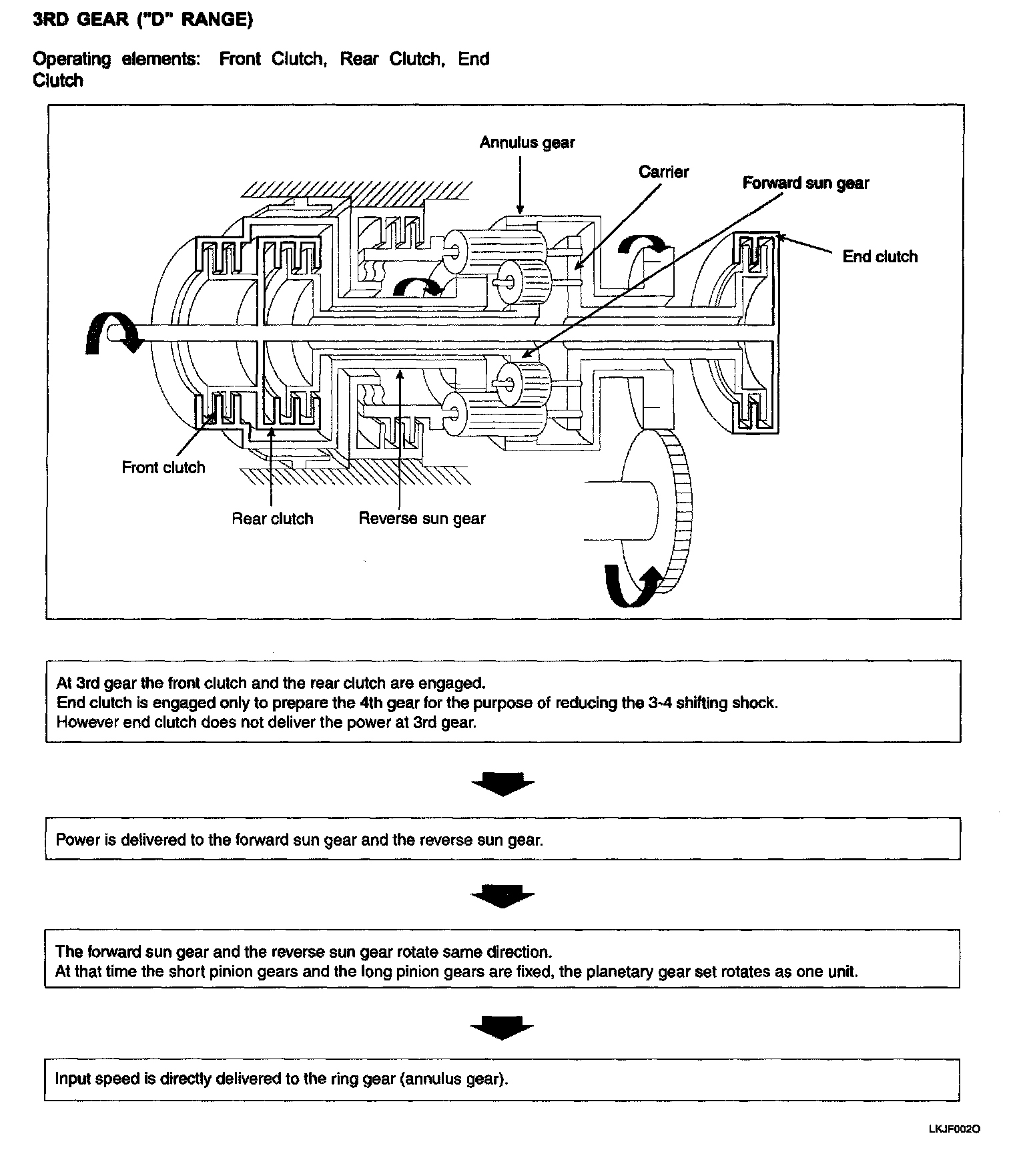 Rear clutch is engaged at 1st-3rd gear of D/2/L range. When it is engaged, forward sun gear of the planetary gear rotates.