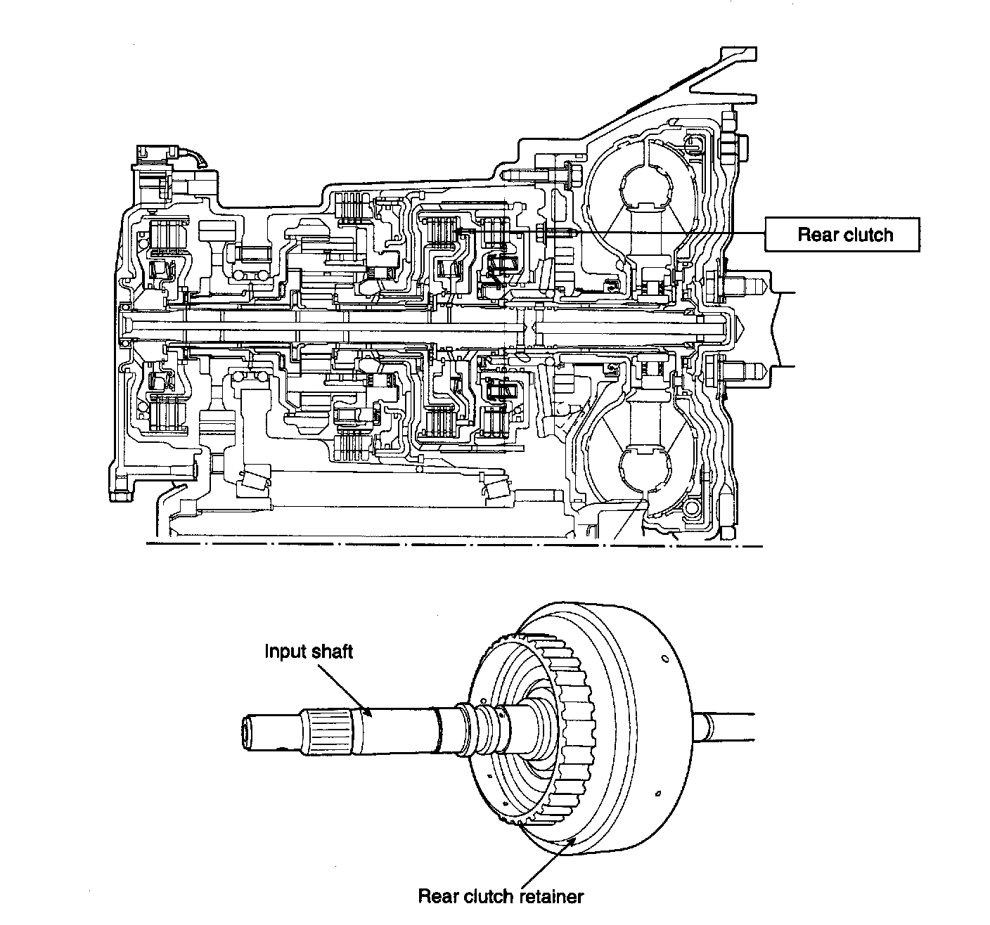 Input shaft -> Rear clutch retainer -> Rear clutch -> Rear clutch hub -> Forward sun gear -> Short pinion
