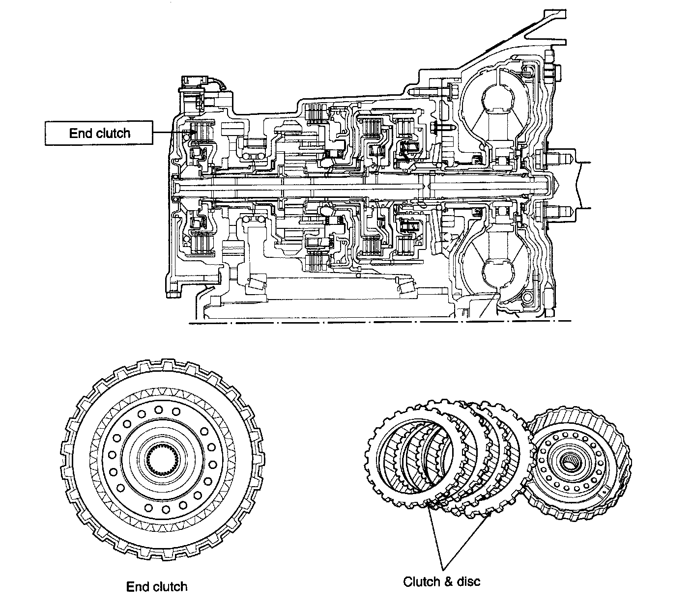 End clutch is composed of a kick down brake band, drum, servo piston and servo switch. It is engaged at 2nd & 4th gear. When it operates, reverse sun gear of the planetary gear is held.