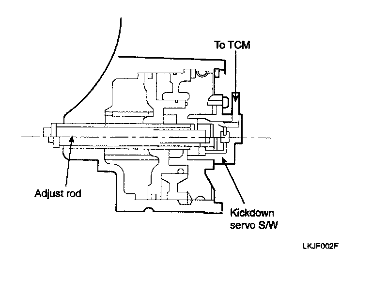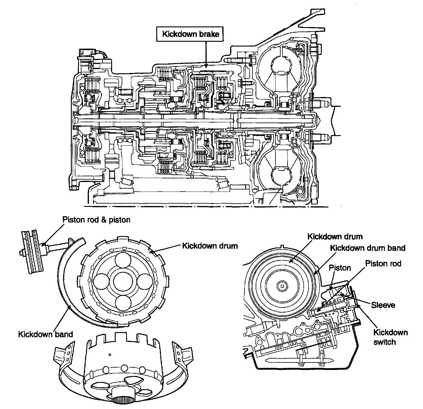 The kickdown brake is a band type brake; it is composed of a kickdown band, drum, kickdown servo, switch and anchor. When the 2nd pressure is admitted to the apply side chamber of kickdown servo cylinder, the kickdown piston and rod moves toward the left, tightening the brake band to hold the kickdown drum. As a result, the reverse sun gear (interlocked with the kickdown drum) is held. This brake functions during 2nd gear and during overdrive. The kickdown servo switch detects the position of the kickdown piston just before the brake is applied, and sends the signal to the transaxle control module. Using this signal, the transaxle control module controls the 2nd pressure both before, and during application of the brake. In the initial control stage or until just before the kickdown brake is applied, a higher 2nd pressure is supplied to the kickdown servo so that the kickdown piston con move quickly for faster response to the kickdown condition that has been initiated. In the second control stage or while the brake is being applied, the 2nd pressure is regulated at an optimum level so that the band is tightened on the drum the proper amount for good kickdown "feeling".