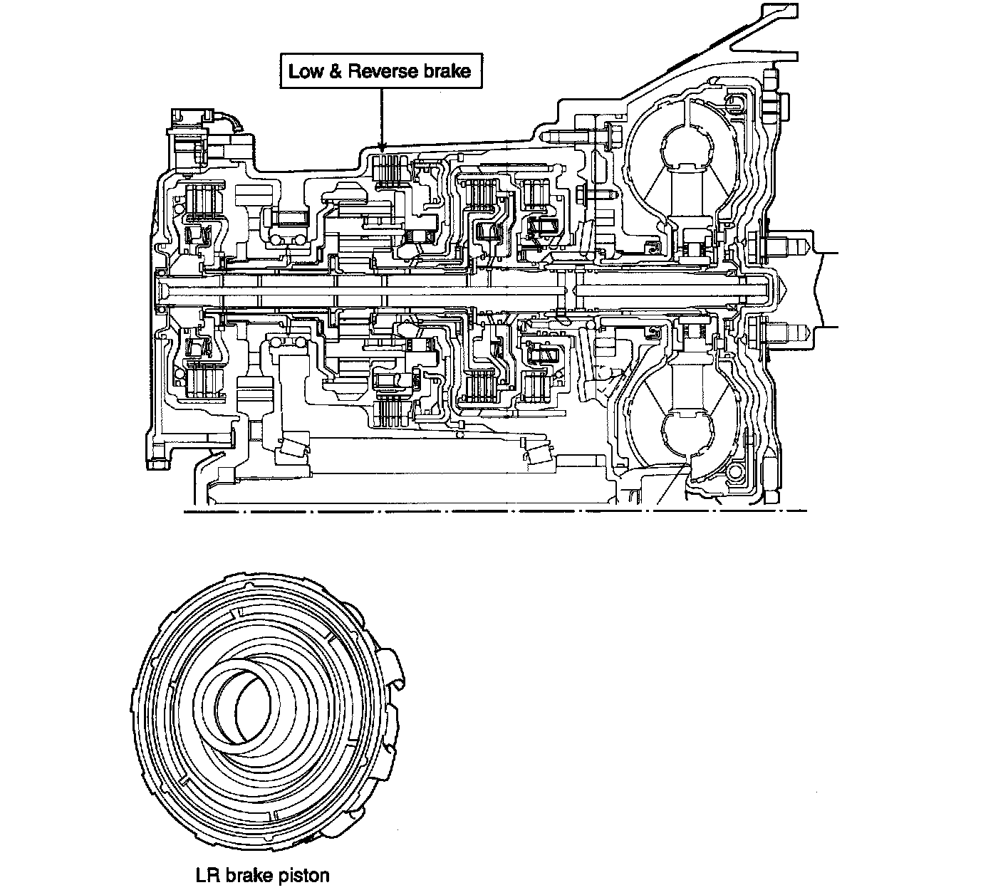 Low & Reverse brake is engaged at 1st gear of L range and R range. When it operates, the planetary carrier is held.