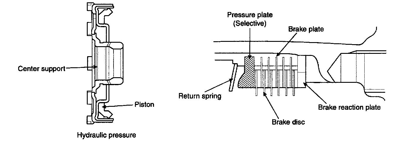 Low & reverse brake is of the multiple disc type and is composed of a center support, disc plates and a piston. The brake operates when the shift is in 1st gear in the "L" range or back gear. It fastens the carrier in the planetary gearing set. That is, the shafts of the long and short pinions are fastened.