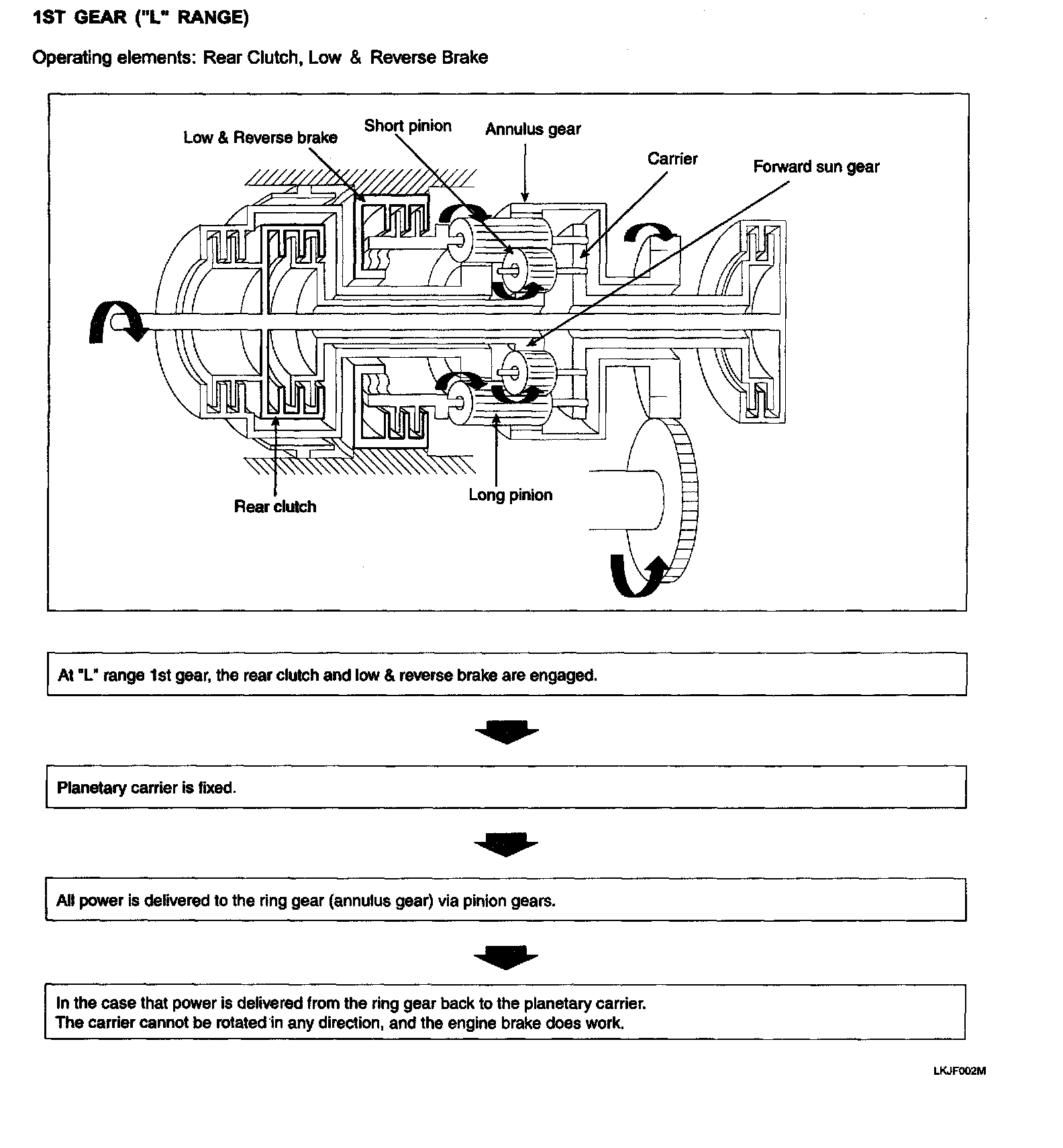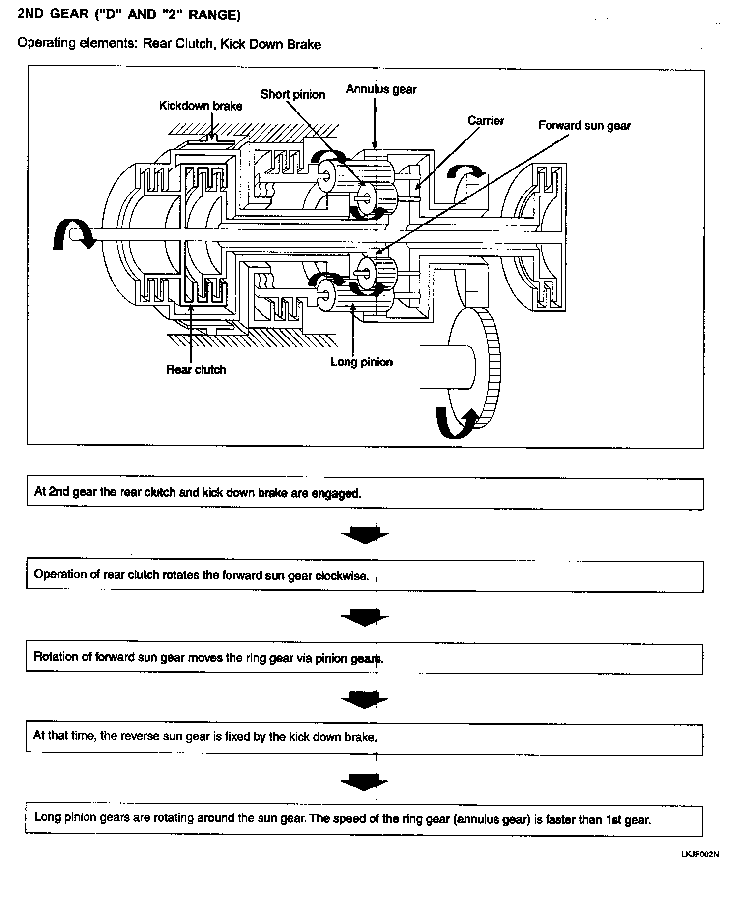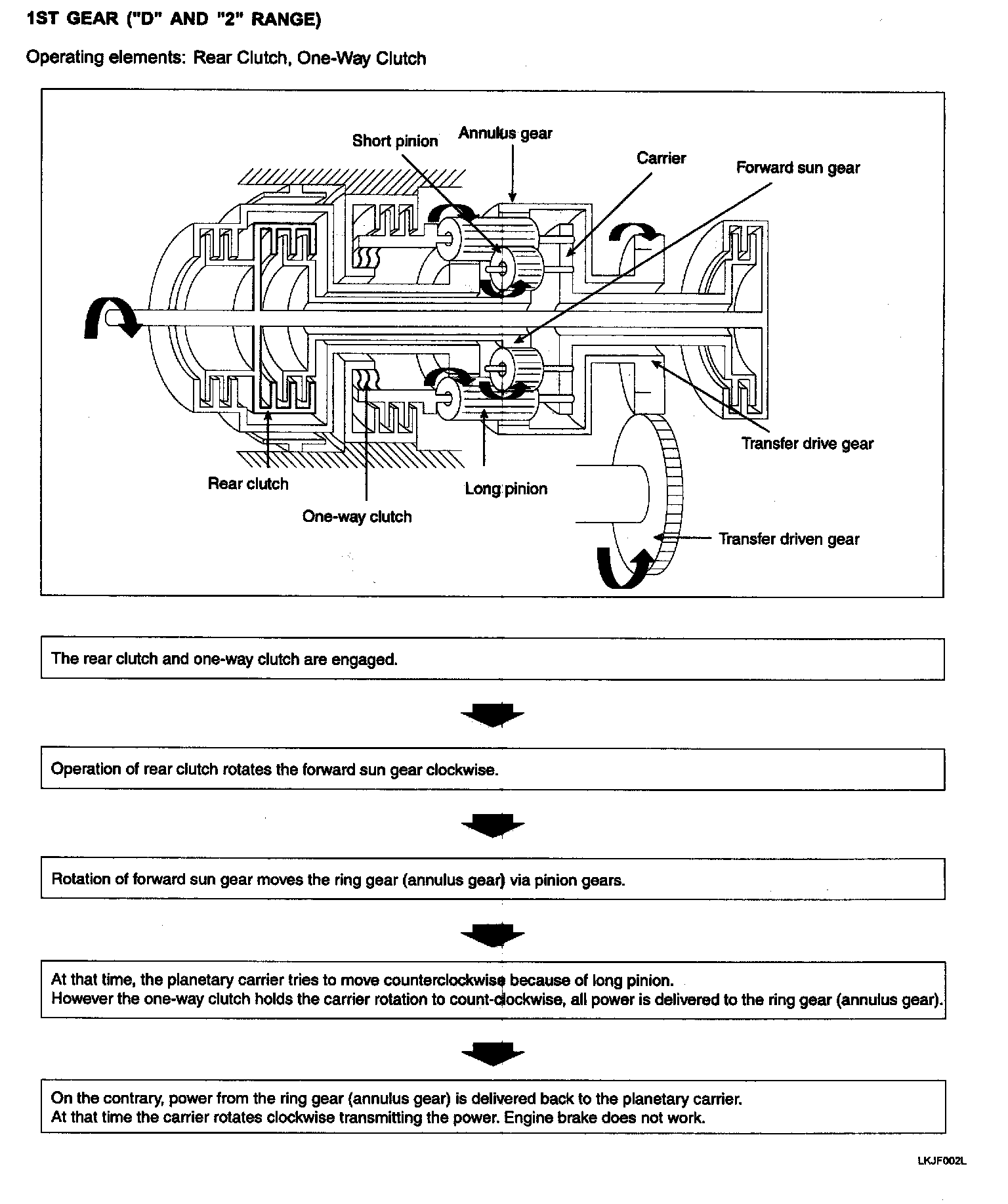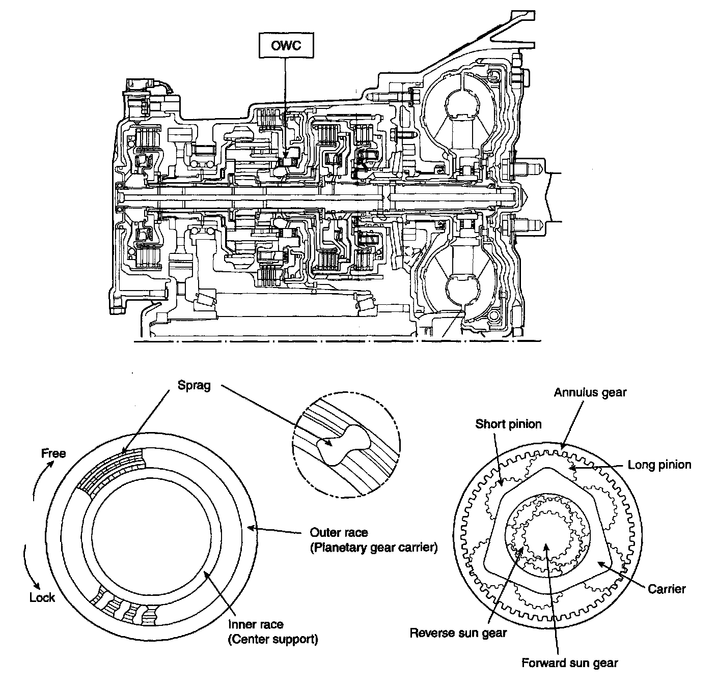 One-way clutch is of the sprag type and is incorporated between the pinion carrier and the center support. In 1st gear (D or 2 range), the long pinion rotates clockwise. This reduces a force which has the tendency to cause the carrier is blocked from rotating in that direction by the one-way clutch. As a result, the long pinion transmits its force to the annulus gear. The carrier, which is coupled with the one-way clutch outer race, is free to turn in clockwise direction. In an engine braking condition under which the annulus gear is turned first, the carrier turns clockwise freely and, therefore, the engine braking effect is not obtained.