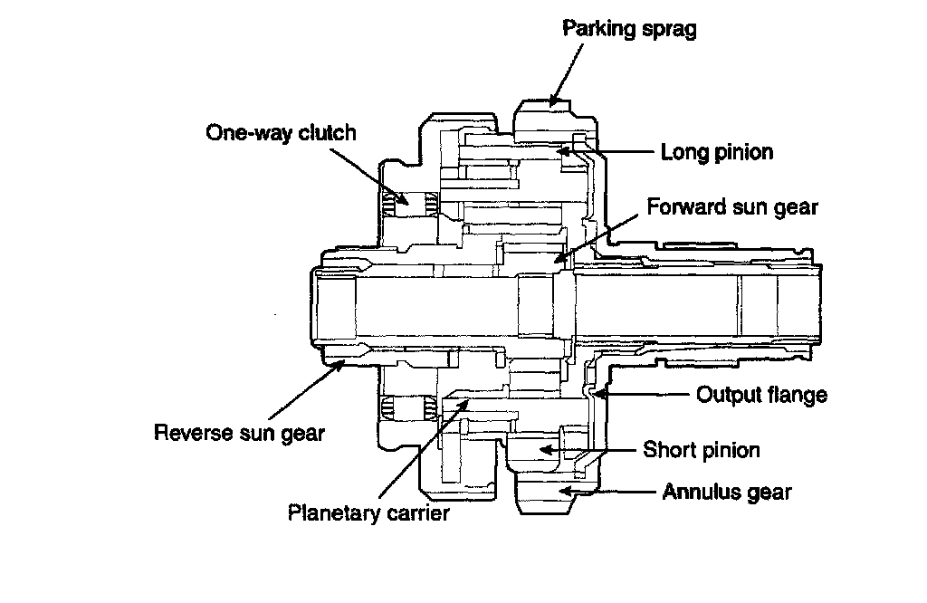 The planetary gear set incorporated in this transaxle consists of a forward sun gear, a reverse sun gear, a short pinion, a carrier to support both pinions, and an annulus gear.