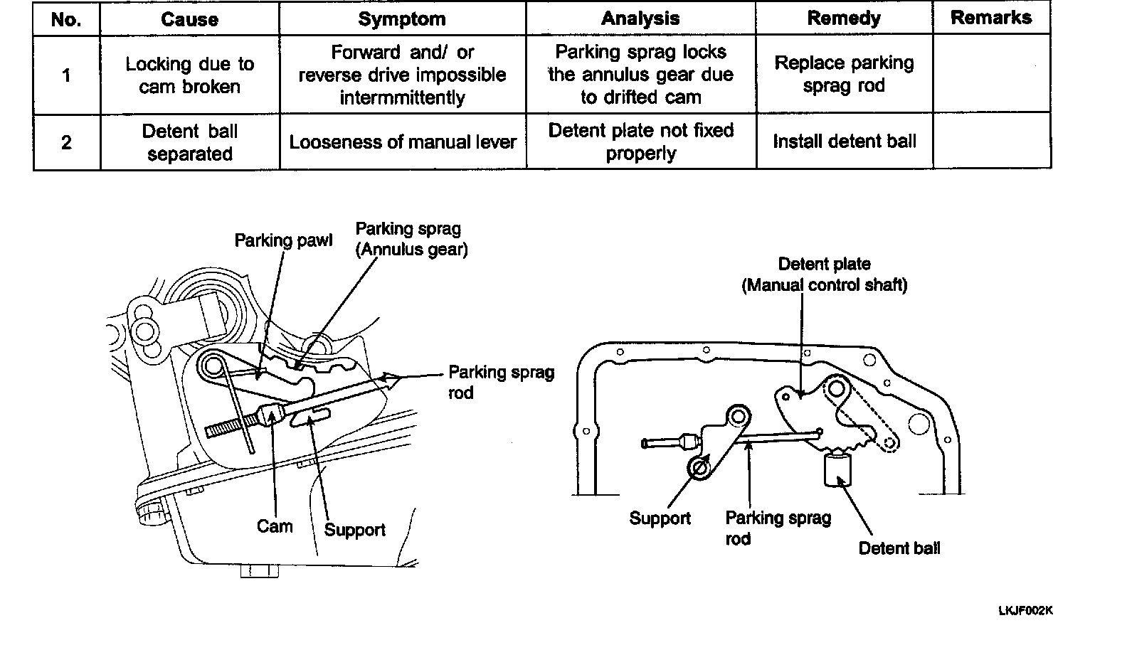 When the shaft is in the P range, the parking pawl engages with the parking sprag provided on outer circumference of the annulus gear to fasten the output shaft, to prevent the wheels from rotating. In other words, when the select lever is set to the P range, the detent plate and the parking sprag rod move in the direction of arrow, causing the cam on the parking sprag rod to push up the parking pawl to engage with the sprag.
