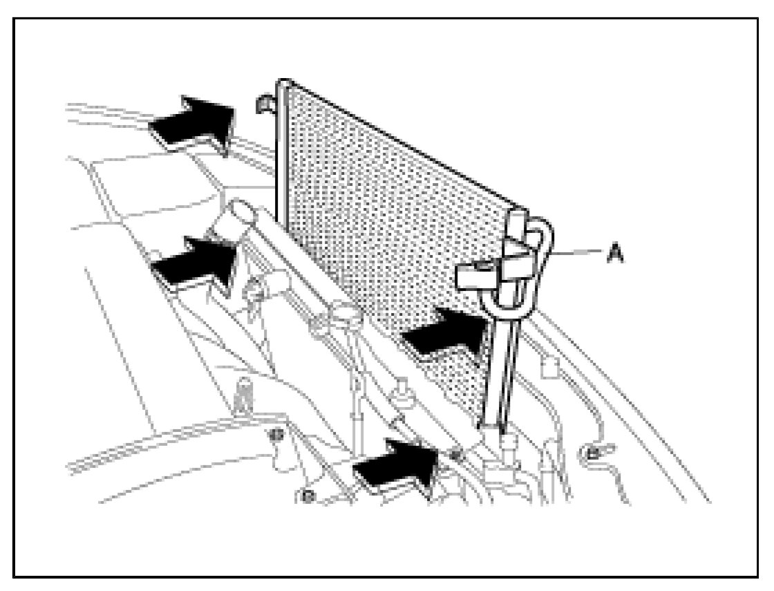 8. Remove the bolts (A), then remove the condenser (B) by lifting it up. Be careful not to damage the radiator and condenser fins when removing the condenser.