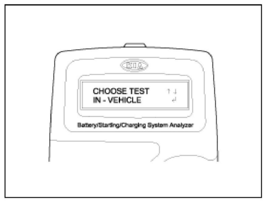 2. The tester will ask if the battery is connected "IN A VEHICLE" or "OUT OF A VEHICLE". Make your selection by pressing the arrow buttons; then press ENTER.