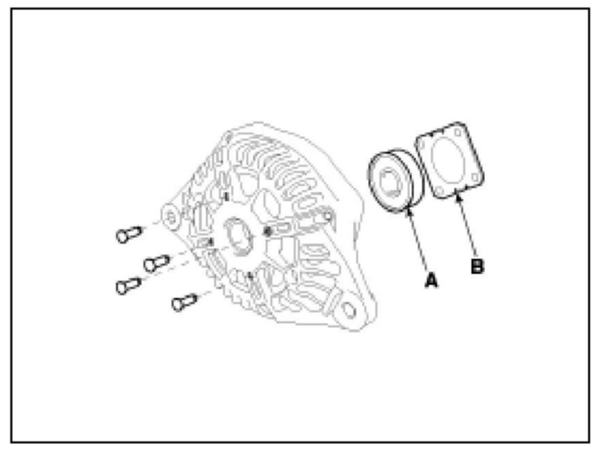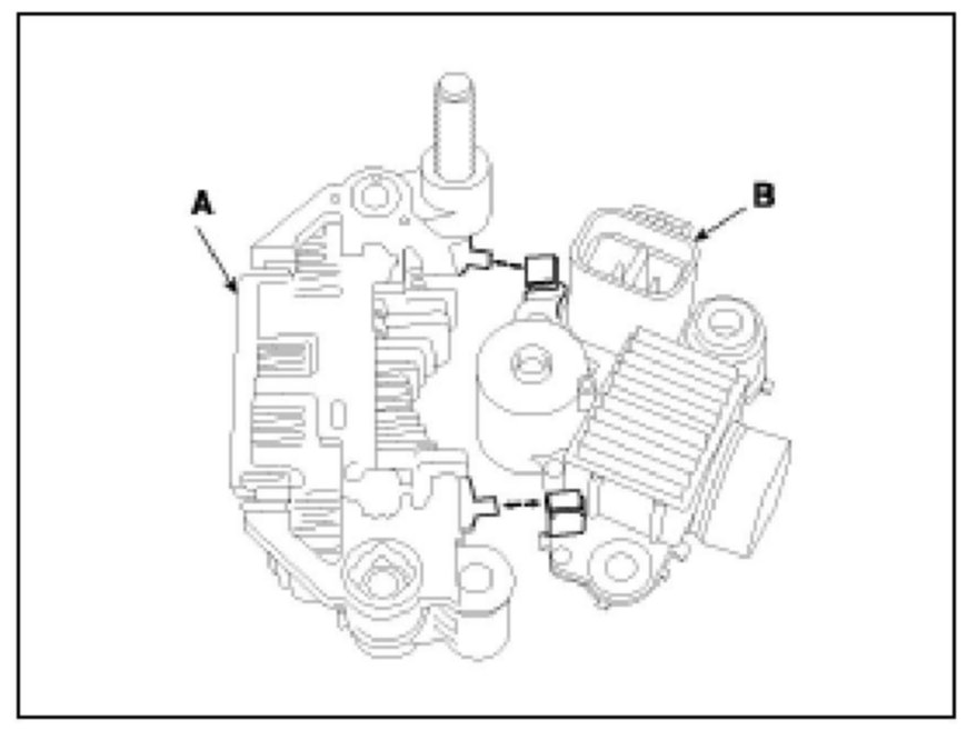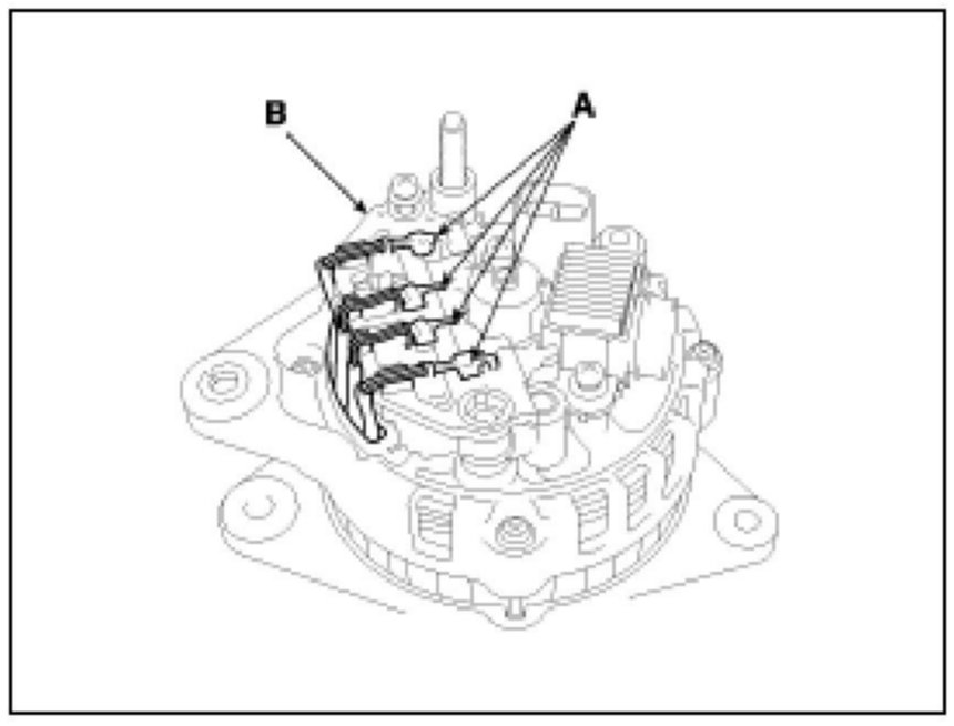 2. Unsolder the 4 stator leads (A) to the main diodes on the rectifier (B).