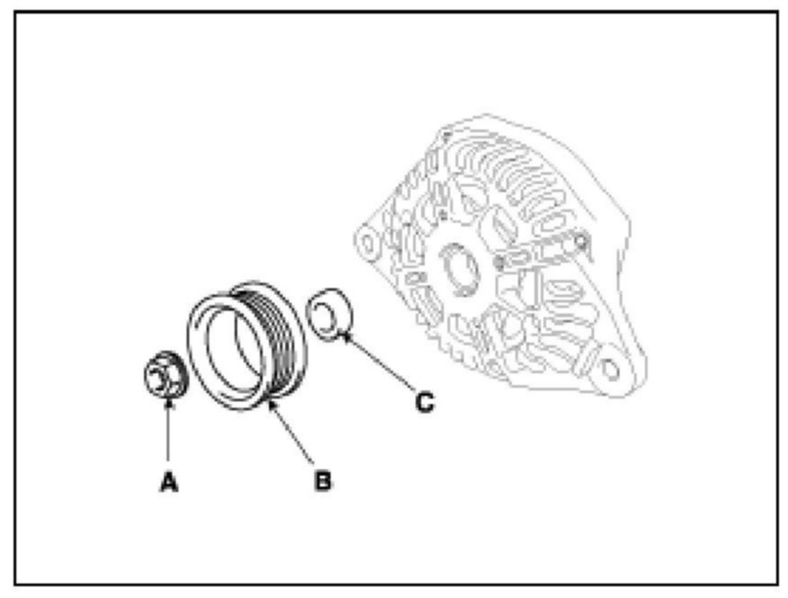 6. Remove the nut (A), pulley (B) and spacer (C).