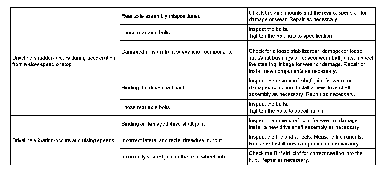 - Driveline vibration. Go to Troubleshooting.