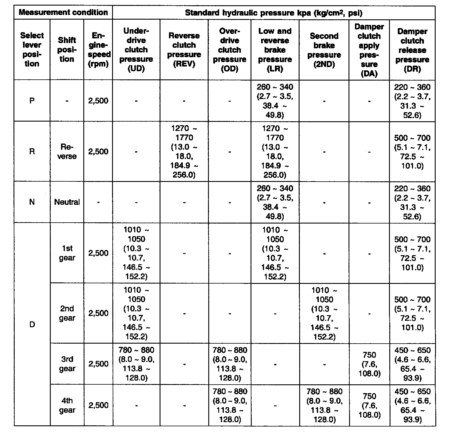 5. If a value is outside the standard range, correct the problem while referring to the hydraulic pressure test diagnosis table.