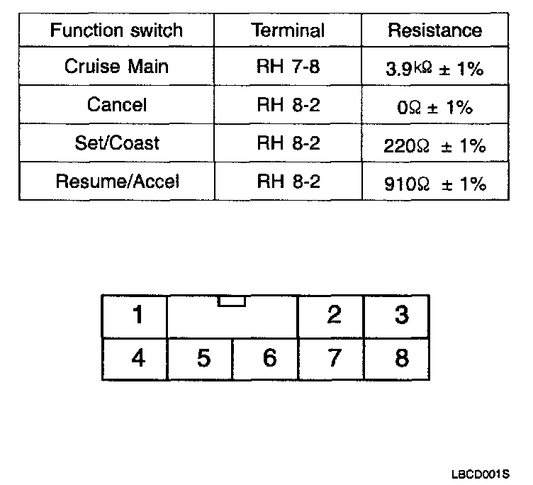 2. Measure resistance between terminals on the control switch when each function switch is ON (switch is depressed).
