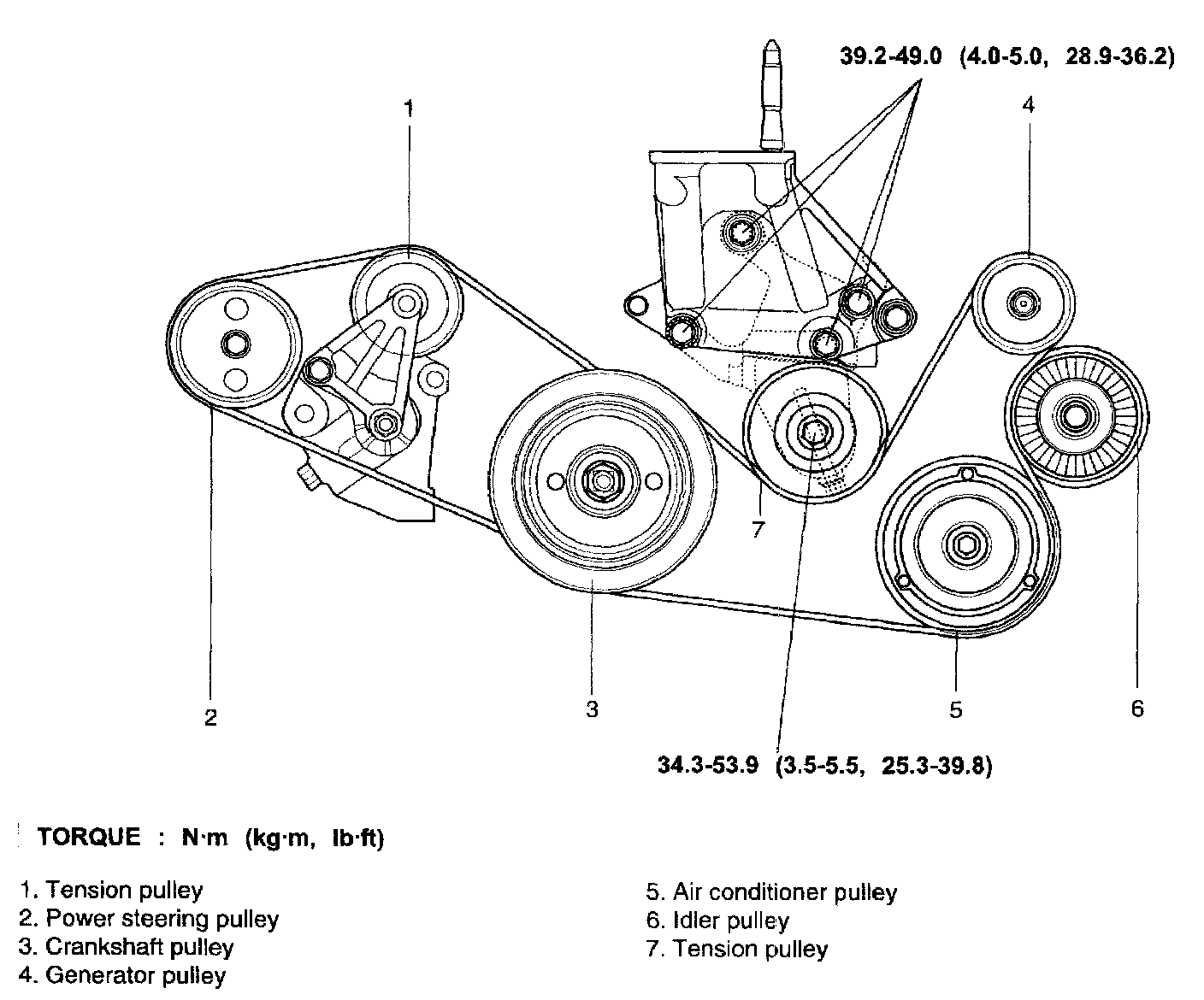 Tensioner assembly bolt: 39.2 - 49.0 Nm (4.0 - 5.0 kg-m, 28.9 - 36.2 ft. lbs.)