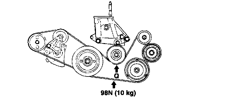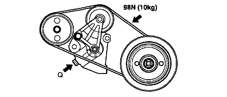 4. Adjust the power steering belt tension to specification by turning the adjusting bolt (Q) clockwise or counterclockwise