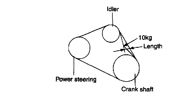 CHECKING POWER STEERING BELT TENSION1. With the engine off, press the belt applying a pressure of 98 N (10 kg, 22 lbs.) at the specified point, and measure the deflection to confirm that it is within the standard value range.