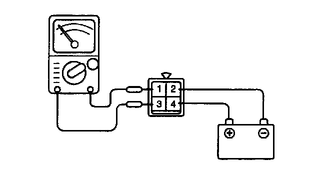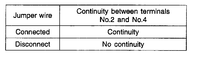 3. Check the continuity between terminal (2) and terminal (4) of the A/T control relay when the jumper wires are connected to and disconnected from the battery.