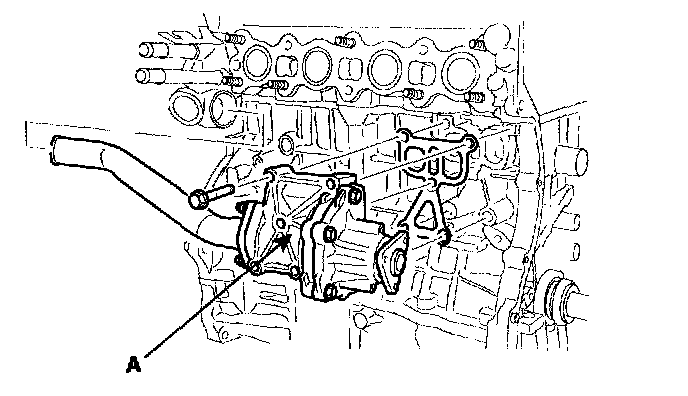 1) Install the water pump (A) and a new gasket with the 5 bolts.