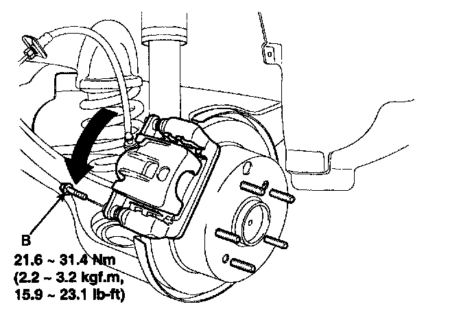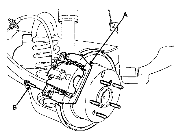 3. Remove the guide rod bolt (B). After raise the caliper assembly (A), support it with a wire.