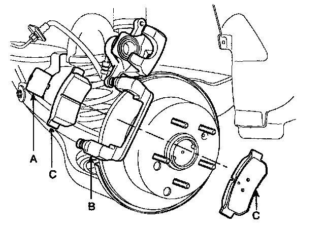 4. Remove the pad shim (A) and pad assembly (C) from caliper bracket (B).