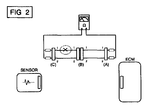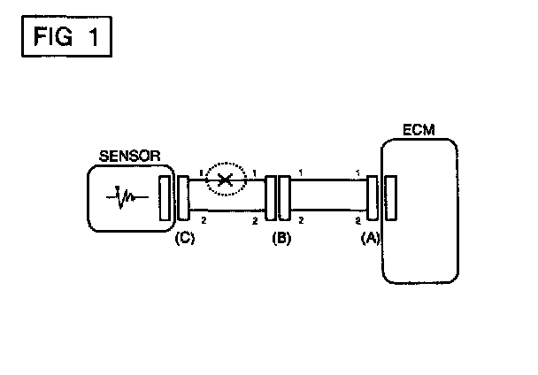 In [FIG.2] the measured resistance of line 1 and 2 is higher than 1 MOhms and below 1 Ohm respectively. Specifically the open circuit is line 1 (Line 2 is normal). To find exact break point, check sub line of line 1 as described in next step.