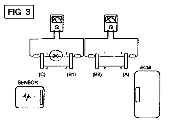 b. Disconnect connector (B), and measure for resistance between connector (C) and (B1) and between (B2) and (A) as shown in [FIG. 3]