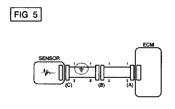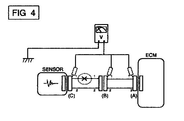 a. With each connector still connected, measure the voltage between the chassis ground and terminal 1 of each connectors (A), (B) and (C) as shown in [FIG. 4].