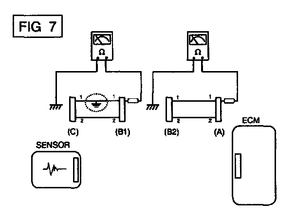 b. Disconnect connector (B), and measure the resistance between connector (A) and chassis ground, and between (B1) and chassis ground as shown in [FIG. 7].