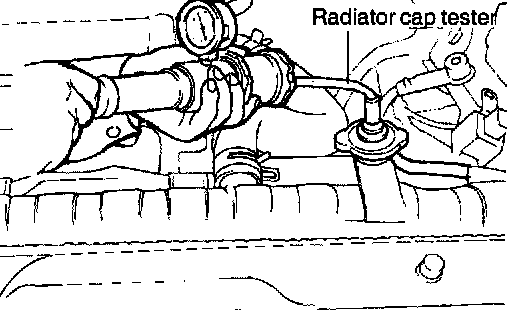 3. Install a radiator cap tester to the radiator filler neck and apply 150 kPa (21 psi, 1.53 kg/cm2) pressure. Hold for two minutes in that condition, while checking for leakage from the radiator, hose or connections.