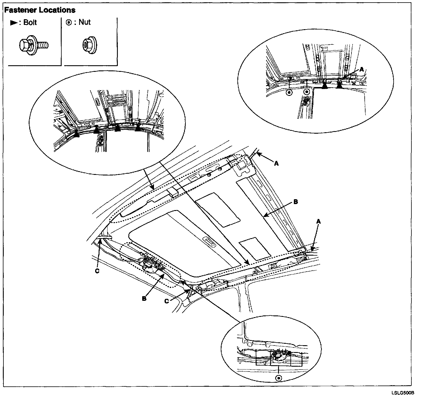 4. After loosening the mounting bolts and nuts, remove the sunroof assembly (B).
